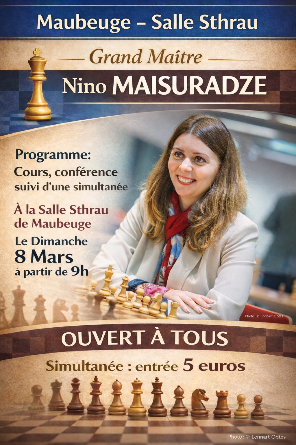 Ce dimanche 8 mars, à l’occasion de la semaine de la mixité, le Malbodium Chess Club reçoit la Grande Maître Féminine Nino Maisuradze !