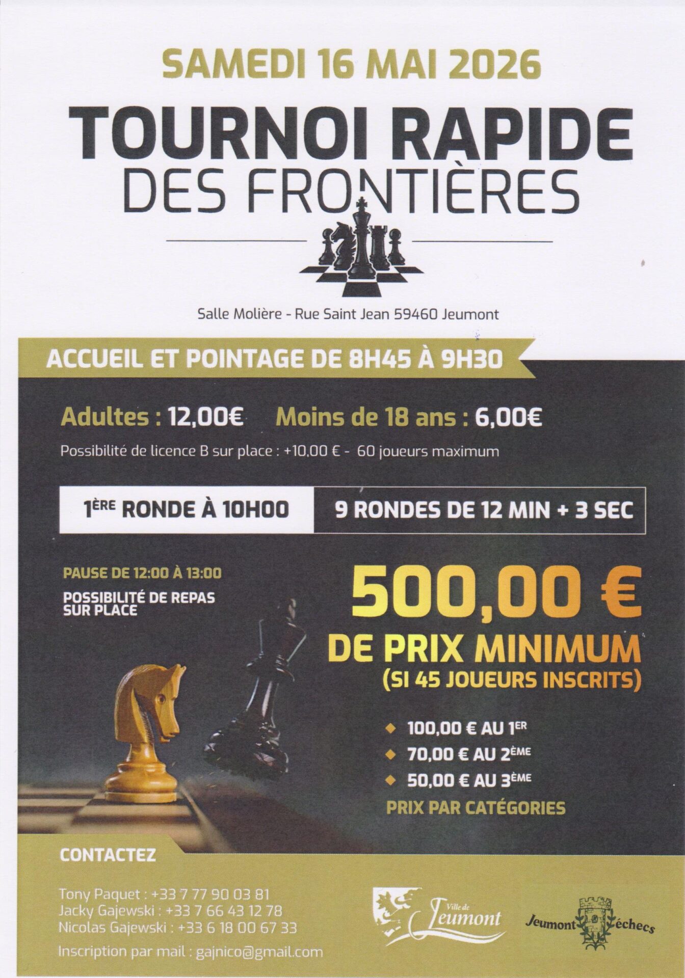 ♟ Jeumont-Echecs organise le 1er Rapide des Frontières le Samedi 16 Mai 2026 !