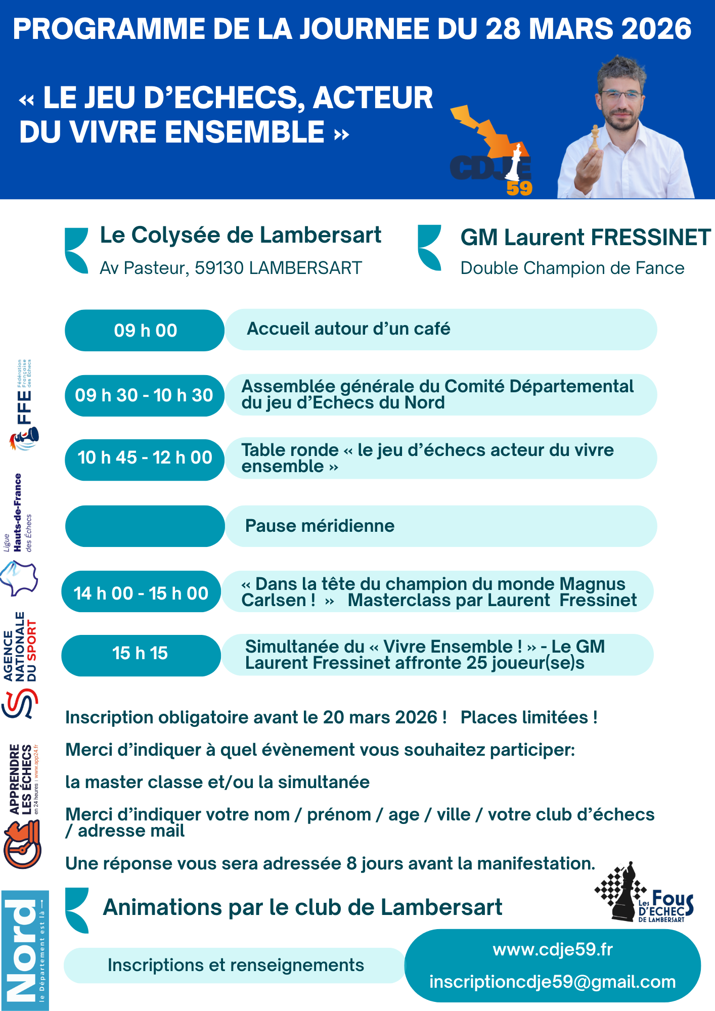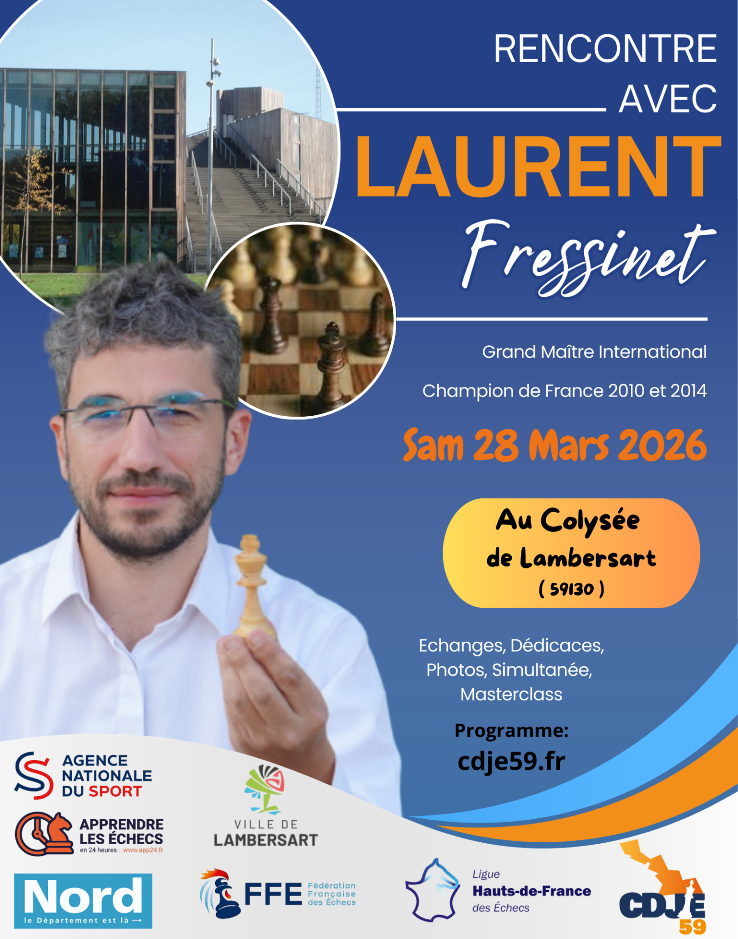 Nous organisons une journée « Echanges et Simultanée » avec le GM Laurent Fressinet, double Champion de France, au Colysée de Lambersart ! Cela sera l’occasion, le matin, de faire notre AG des clubs du Nord.